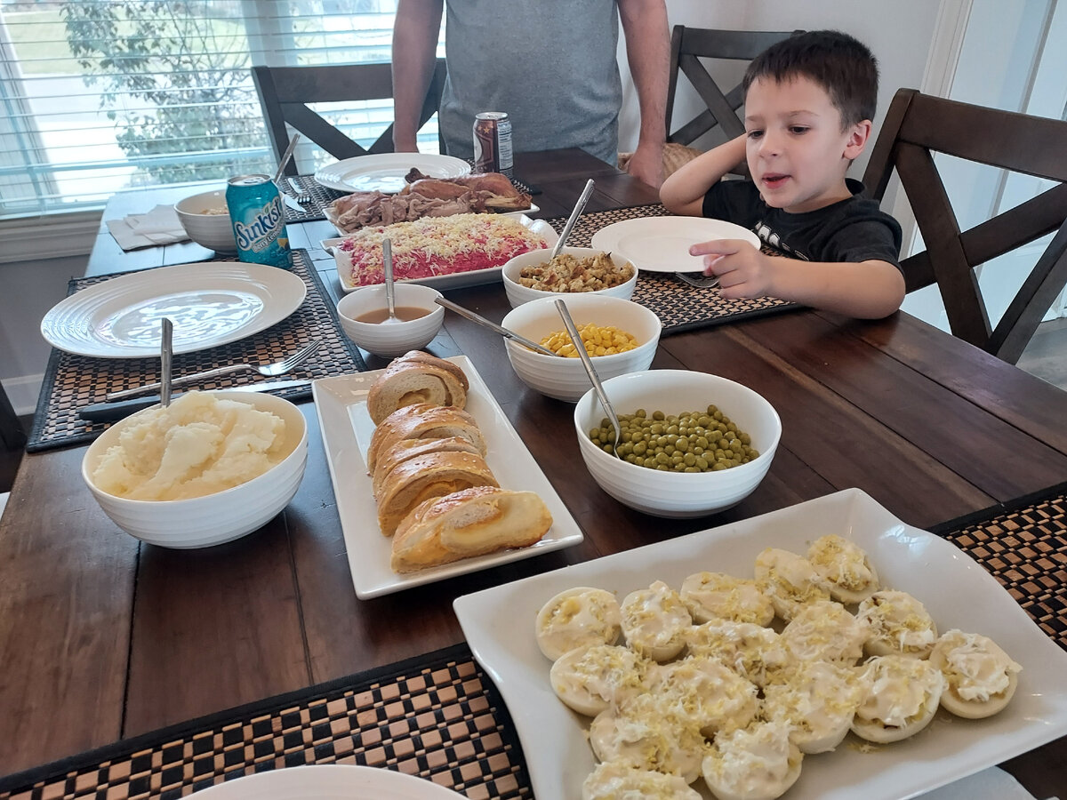 У каждого свой взгляд на историю и традиции этого праздника. Но так или иначе, все американцы считают его одним из самых важных семейных праздников. По возможности все собираются в родительском доме и смех, веселье и конечно непременно богато накрытый стол и во главе индейка. А вот все остальное....горошек, кукуруза, оливки, чипсы ...это уже дополнение. Но не в нашем доме😁😁😁. Рядом с индейкой крабовый салат, шуба, фаршированные яйца, пюре. Все, что любимо мной с детства и является неприменными блюдами на праздничном столе. Какая бы история не была у этого праздника, но сейчас это просто семейный праздник и детские воспоминания. Да, муж крабовый салат и шубу не ценит🤷♀️, как и дети. Готовлю исключительно для себя любимой😁😁😁