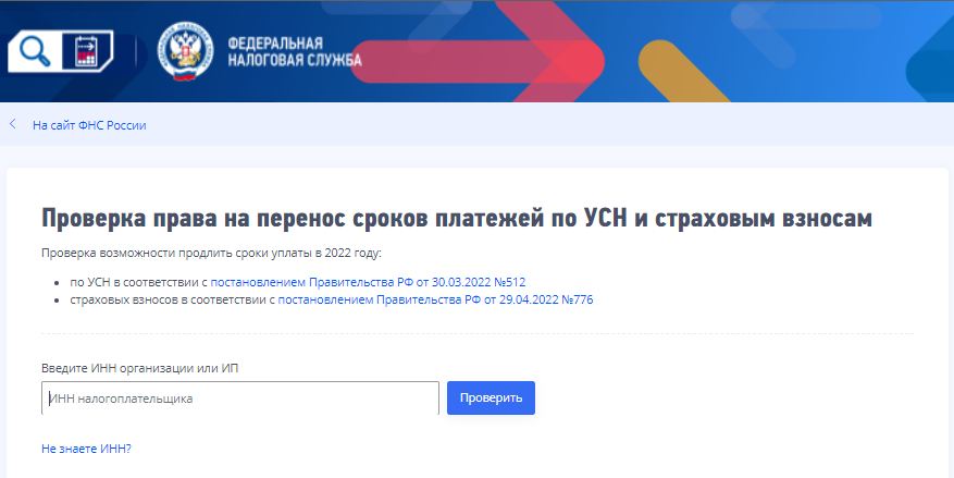До 30 ноября нужно перечислить: по которым получена отсрочка. Напомним, отсрочку уплаты налога по упрощенке за 2021 год и авансового платежа за первый квартал 2022 года на шесть месяцев весной получили определенные виды бизнеса на УСН. Налог и авансовый платеж они могут уплачивать равными частями в течение шести месяцев, следующих за новым сроком (письмом ФНС от 31.03.2022 № СД-4-3/3868@). Быстро проверить, есть ли у вас право на отсрочку, поможет новый интерактивный помощник от ФНС. Пользователю достаточно ввести свой ИНН: Система проверит, соответствует ли налогоплательщик требованиям постановления, и выдаст результат — можно или нет воспользоваться мерой поддержки: Рекомендуем обзор последних новостей по антикризисным мерам от «КонсультантПлюс». Пробный доступ можно получить бесплатно.