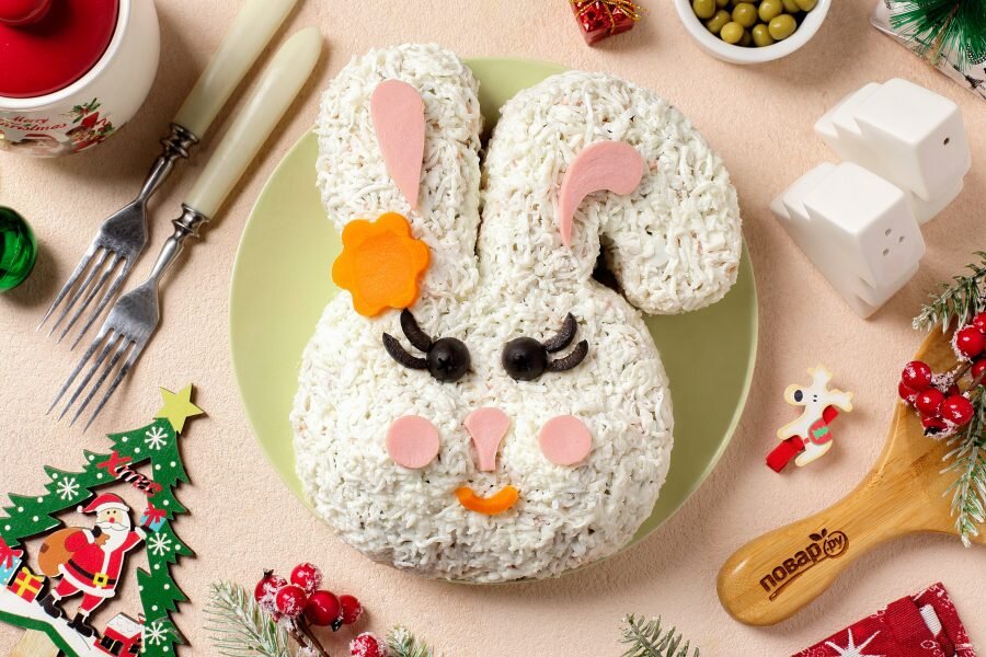 Отложенные ранее белки натрите на терке и выложите ровным слоем сверху. Используя ломтики колбасы, моркови и оливки сделайте ушки, глазки, нос, щеки и рот кролика.