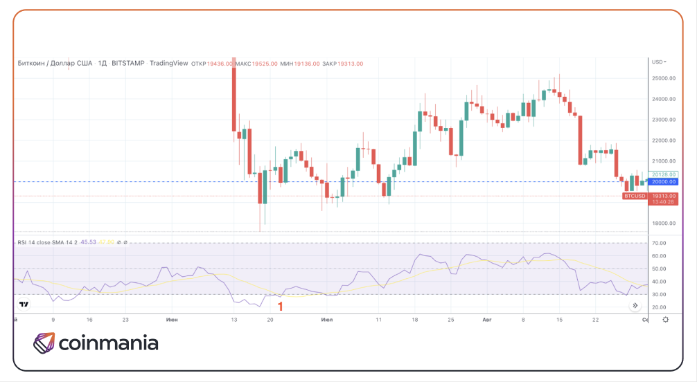 Сигнал срабатывает только тогда, когда индикатор уходит выше уровня 30. После этого вы можете открывать позицию на покупку. Если вы открываете позицию в тот момент, когда индикатор все еще находится в зоне 0-30, вы рискуете потерять средства, так как RSI может двигаться в этом промежутке в течение долгого времени, пока у покупателей не будет достаточно силы, чтобы повысить цену актива. На графике ниже вы можете наблюдать выход индикатора (фиолетовая линия) из зоны перепроданности (1).