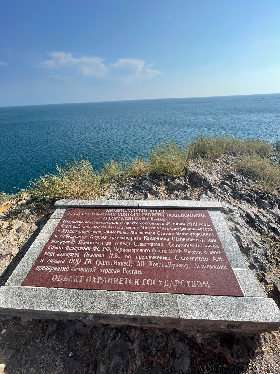 Яшмовый пляж и чёрные скалы встречают вас, как только вы преодолеваете 700 ступеней вниз от Георгиевского монастыря» Мыс Фиолент расположен в 15 километрах от центра Севастополя в сторону Ялты. Здесь берёт своё начало Главная (Южная) гряда Крымских гор, которая заканчивается мысом Ильи возле Феодосии. Фиолент сложен породами вулканического происхождения, остатками действия древнего вулкана, действовавшего здесь в среднеюрское время (152—163 млн лет назад). Прямо в центре стоит небольшой остров, куда можно доплыть и подняться наверх. Наверху вас встретит православный крест и красивый вид на море. Честно скажу - занятие не для каждого. Если вы плохо плаваете или боитесь высоты - самостоятельно лезть не рекомендую. Плыть минут 7 от берега и залазить по старым и скользким скалам.