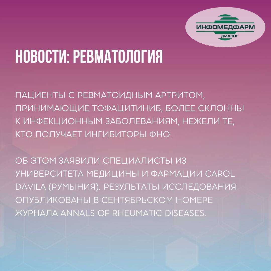✔️Об этом заявили специалисты из Университета медицины и фармации Carol Davila (Румыния). Результаты исследования опубликованы в сентябрьском номере журнала Annals of Rheumatic Diseases. Для оценки распространенности инфекций среди пациентов с ревматоидным артритом исследователи проанализировали данные рандомизированного открытого исследования ORAL Surveillance 3b/4, ко- торое проводилось с марта 2014 г. по июль 2020 г. ✔️В исследование были включены пациенты с ревматоидным артритом, которым не уда- лось достичь ремиссии на фоне приема метотрексата. Это были люди 50 лет и старше, имеющие по край- ней мере один дополнительный сердечно-сосудистый фактор риска. Участников рандомизировали на группы: получавших пероральный тофацитиниб в дозах 5 мг и 10 мг 2 раза в день и принимавших ингибитор ФНО — адалимумаб — подкожно каждые 2 недели. ✔️В начале 2019 г. исследование было обновлено в связи с необходимостью снижения дозы тофацитиниба с 10 мг до 5 мг в связи с увеличением числа нежелат