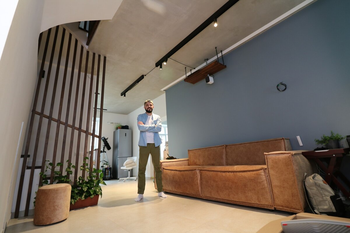 Владелец дома Азамат - дизайнер, поэтому дизайн-проект разработал самостоятельно. А мы воплотили все по его задумке. Что у нас получилось Лестница монолитная с плавными переходами между этажами и деревянными рейками в потолок. Выглядит очень шикарно! На полу керамогранит с теплым водяным полом. Для заказчика плитка - идеальное решение, так как на первом этаже есть выход на задний дворик, часто приходится мыть полы. Ламинат с точки зрения долговечности при активной эксплуатации будет проигрывать. Но, если нет теплого пола, керамогранит лучше не делать – будет холодно. У окон на полу на первом этаже вместо конвекторов тоже теплый пол, только трубы лежат чуть ближе, за счет этого тепло у оконных проемов гораздо интенсивнее.На втором конвекторы. По сантехнике у нас сделана рециркуляция воды с первого на второй этаж и установлен бойлер косвенного нагрева, за счет чего теплая вода на второй этаж подается мгновенно. Как рекомендация, если у вас есть бойлер косвенного нагрева, то лучше испол