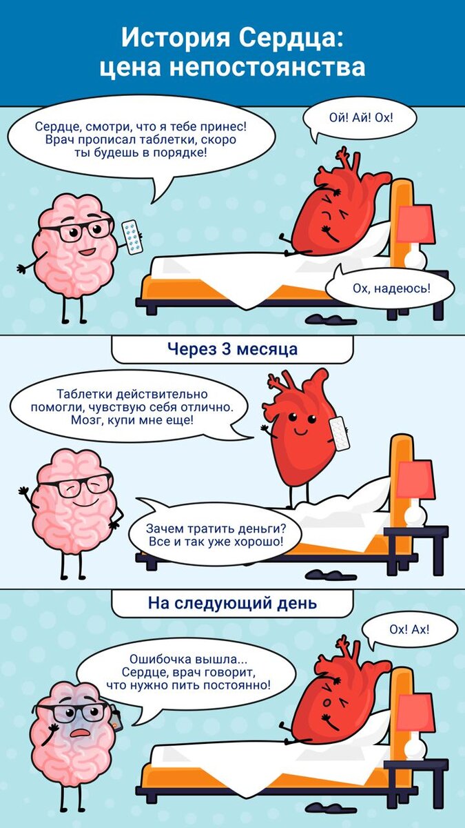 В серии комиксов «История Сердца» рассказываем, как наш мозг мешает правильно лечить сердечно-сосудистые заболевания. «Зачем тратить деньги на лекарства, если ничего не болит?» 一 бережливо замечает мозг. К сожалению, от хронических заболеваний (таких как, например, артериальная гипертензия) нельзя вылечиться 一 но можно предотвратить их дальнейшее развитие и научиться жить с ними полноценно. И даже если ничего не беспокоит, это не значит, что болезнь прошла и исчезла. Главная задача человека с артериальной гипертензией 一 это не только нормализовать самочувствие, но и контролировать заболевание. Регулярный приём антигипертензивных препаратов поддерживает нужную концентрацию действующего вещества в крови. Если прервать лечение, то концентрация начнёт падать, и симптомы могут вернутся. Даже если кажется, что болезнь отступила, самостоятельное прекращение приёма препаратов может усугубить течение болезни. Поэтому не стоит принимать решение об отмене или корректировке лечения самостоятельн