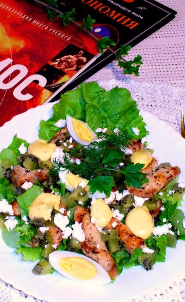 Добрый вечер! Году эдак в 2010, придумался мне салат, на манер Цезаря. И так как дело было весной, готовила я его на день космонавтики, то и назвала - Космо. Салат, по тем временам, был оригинальный и новый. Но и сейчас он такой же вкусный, как и 12 лет назад) * 1 куриное филе, 2 спелых киви, 2 вареных куриных яйца, 50 - 70 гр.сыра "фета", листья салата, укроп, петрушка, сливочное масло, майонез, горчичный соус с апельсином, перец, соль. * Куриное филе вымыть, обсушить, нарезать полосками среднего размера. * Обжарить на сливочном масле, до зарумянивания, посолить, поперчить свежемолотым черным перцем. * Листья салата вымыть, обсушить. Нарвать салат руками, небольшими кусочками и выложить на порционную тарелку. * Сверху салата выложить готовое куриное филе, киви (очистить и нарезать мелко), яйцо, и сыр "фета". * Заправить - майонез смешать с горчично - апельсиновым соусом. Украсить зеленью. Салат с ярким, необычным вкусом, сочетающий в себе свежесть зелени, пикантность курицы с киви