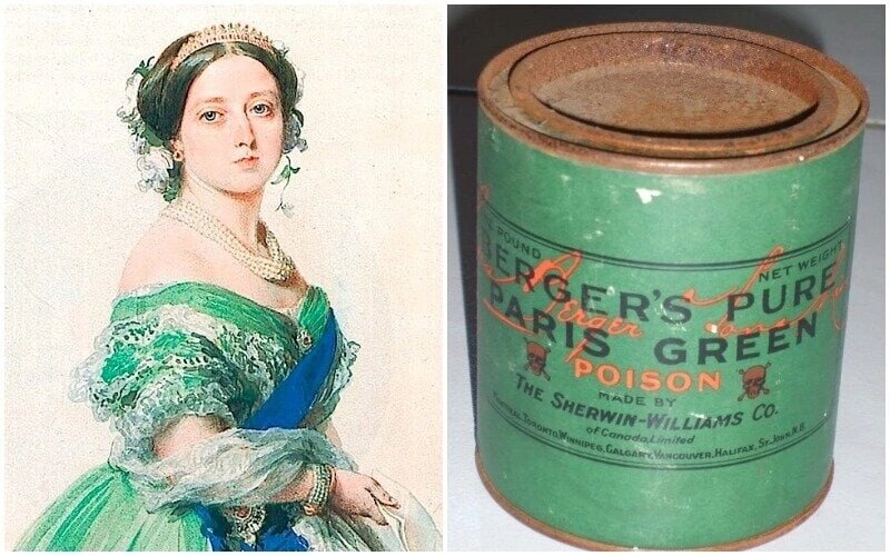В 1775 году аптекарь и химик Карл Вильгельм Шееле изучал мышьяк. проведя какой-то опыт с мышьяком и медью, он получил изумительно-зеленое вещество - гидроарсенит меди. Предприимчивый химик решил заработать и начал продавать это вещество, как краситель. Назвали его по фамилии автора: зелень Шееле. При чем, Шееле прекрасно знал, что мышьяк - это яд. И работал над способами распознания отравления мышьяком. Он предполагал, что краситель ядовит. Но очень беспокоился, что кто-то другой тоже догадается смешать мышьяк с медью и начнет зарабатывать. Поэтому, сообщить покупателям б опасности забыл... Цвет очень понравился европейцам. Началось повальное увлечение. Использовали краситель везде, где только позволяла фантазия. Первыми, как всегда, были французы. Поэтому цвет часто называют "парижский зеленый". Но в Викторианскую эпоху, во всеобщей любви к этому цвету Британия вырвалась в лидеры. Зеленый" Дамам полюбились ткани красивого зеленого цвета. Платья сшитые из окрашенной мышьяком ткан