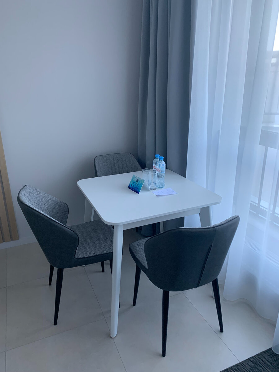 ул. Ленина, 52, Светлогорск Отель новый, построен в 2022году. Номерной фонд состоит из апартаментов без обслуживания и номеров с обслуживанием. Местоположение отеля очень удачное, 10 минут от ЖД вокзала, рядом автобусная остановка, в здании отеля на первом этаже находится магазин SPAR. До пляжа и набережной идти минут 15, до Янтарь-холла пешком 20 минут. Рядом с отелем есть прогулочная зона вдоль озера, где много детских площадок, веревочный парк, кафе. Отель предоставляет номера с завтраками. Во время моего пребывания еще не было шведского стола, но был достаточный выбор из общего меню, куда входили каши, сырники, сырная тарелка, рыбная тарелка, различные напитки. Очень вкусно. Интерьер номера очень приятный, новый современный ремонт, есть кухонная зона с необходимым наполнением, холодильник, микроволновка. В зоне сану