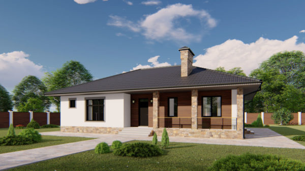 Проект стильного одноэтажного дома с актуальной отделкой фасада, большой террасой и тремя спальнями, 121 кв.м.
