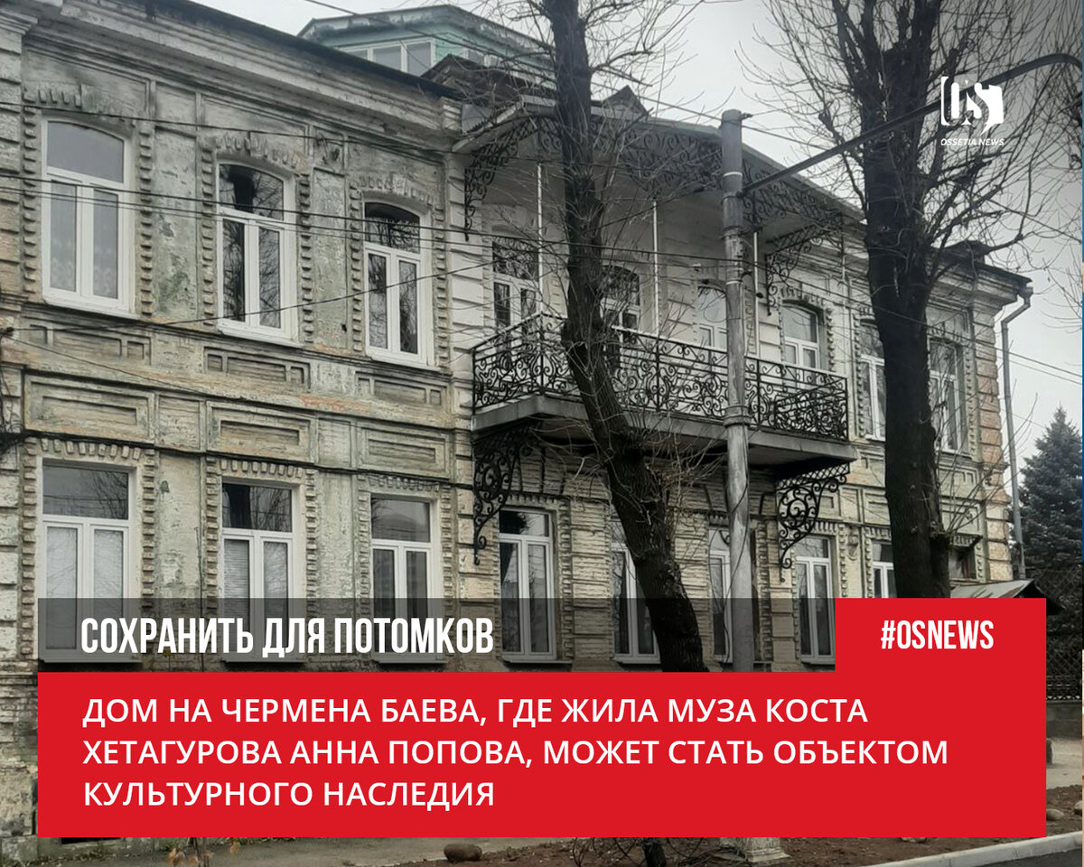 Об этом сообщает комитет по охране и использованию культурных объектов республики. «Началась процедура общественного обсуждения Акта государственного историко-культурной экспертизы выявленного объекта культурного наследия – «Дом Поповых, где в 80-е годы XIX века часто бывал К.Л.Хетагуров. 1875 г.». По его результатам здание может быть внесено в Единый государственный реестр памятников истории и культуры России», – говорится в тексте. Напомним, 2-х-этажный кирпичный дом на ул. Чермена Баева,11 – одно из тех сохранившихся зданий Владикавказа, которые тесно связаны с биографией и творчеством К. Л. Хетагурова. Он принадлежал армянскому купеческому семейству Поповых, хорошо известному во Владикавказе. У Поповых были сыновья и дочь Анна, в которую был влюблен Коста Хетагуров.