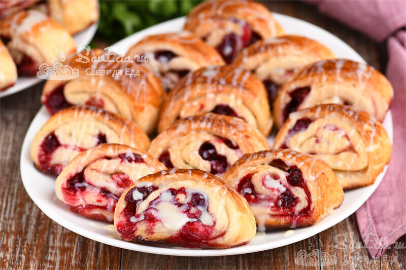 Очень люблю эту выпечку за простоту в приготовлении, аромат, вкус, сочность и разнообразие. Готовить ее можно с любыми замороженными ягодами, которые есть в морозильной камере. Потребуется всего 4 ингредиента и немного времени на приготовление. Порции 26 шт. Время подготовки 15 минут Время приготовления 20 минут Ингредиенты Инструкции 1. Для приготовления беру слоеное дрожжевое тесто. Изделия из него получаются пышными, не слишком слоеными и вкусными. Предварительно его размораживаем. В пачке идет 2 квадратных пласта по 250 г. 2. Присыпаем поверхность мукой, раскатываем 1 пласт в прямоугольник. Тесто посыпаем сахаром (2 ст. л.). Оставляем с верхней стороны 3-4 см. 3. Равномерно распределяем замороженные ягоды (1/2 часть, у меня брусника). Можно использовать любые свежие или замороженные ягоды. 4. Сворачиваем все в рулет (шов снизу). 5. Разрезаем рулет на небольшие рулетики, получается 13-14 шт. Размещаем на противне (у меня на дне смазанная маслом пекарская бумага). Готовим второй пла