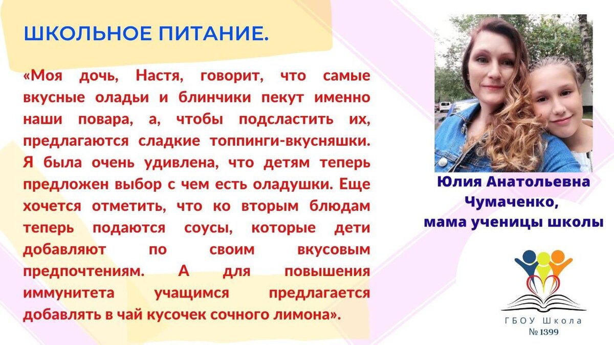 ✨В новом учебном году питание в школьной столовой изменилось. Член Управляющего совета, член финансово-хозяйственной комиссии, Татьяна Викторовна Тамилина, решила проверить, что за нововведения произошли теперь в питании наших учащихся, а самое главное - улучшилось ли качество школьного питания. 🎤«В нашей школьной столовой учащиеся питаются по расписанию. Хочется отметить несколько плюсов: у учеников появилась возможность выбора напитков на завтрак и обед; на обед предлагается несколько первых блюд, которые являются любимыми у детей. А вот подача овощей – фишка питания по-новому. 🥗Овощи для салата все подаются раздельно, это позволяет самостоятельно составить каждому учащемуся свой собственный эксклюзивный салат и заправить растительным маслом, которое стоит на обеденных столах». ✨Мы решили пообщаться с мамой ученицы 4 класса «А», Юлией Анатольевной Чумаченко и спросить родительское мнение о новой системе питания. 🎙«Моя дочь, Настя, говорит, что самые вкусные оладьи и блинчики пеку