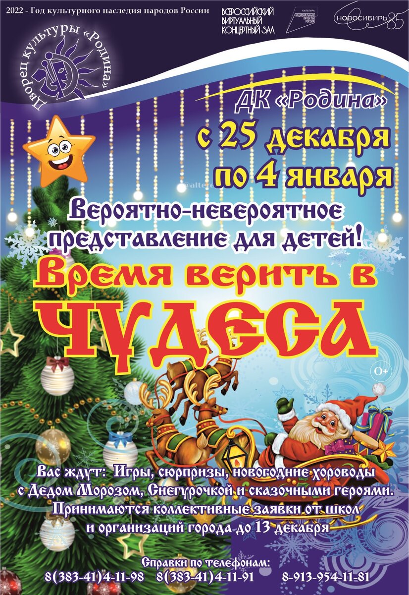 «Время верить в чудеса» Вероятно-невероятное представление для детей 0+ С 25 декабря 2022 года по 4 января 2023 года Новый год - любимый праздник взрослых и детей. Именно в Новый год происходит волшебство, случаются чудеса, и оживает сказка. Дворец культуры «Родина» приглашает на вероятно-невероятное представление для детей «Время верить в чудеса». Вас ждут: игры, сюрпризы, новогодние хороводы с Дедом Морозом, Снегурочкой и сказочные чудеса. Дворец культуры «Родина» принимает заявки от школ и организаций города на проведения новогодних утренников. Количество представление органично. Позаботитесь о празднике заранее. Справки по телефонам 8(383-41) 4-11-98 , 8(383-41) 4-11-91, 89139541181 МАУ «Дворец культуры «Родина» г. Бердск, ул. Микрорайон, 48Б Сайт: https://rodinaberdsk.ru ВК: https://vk.com/dkrodina.berdsk 0+ Реклама Источник: сайт Бердск-Онлайн
