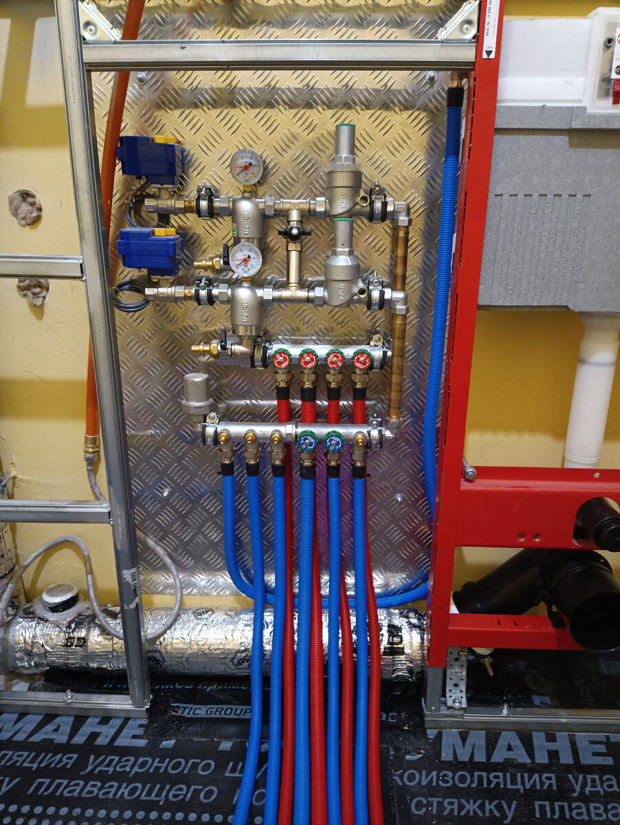 После сборки и установки коллектора приступаю к разматыванию труб и подключение к водорозеткам. Труба Rehau stabil на все точки водоразбора 16мм труба, а на ванну пустил 20мм. Трубы к полу крепил при помощи виброизоляции. Трубы протянуты в гофре Stout 20мм для 16 трубы и 25 гофра для 20мм трубы. Трубы в стенах дополнительно упаковал в теплоизоляцию. Водорозеточки выставил по уровню во всех плоскостях и закрепил к стене, также упаковал в теплоизоляцию, после отделки обрежу ;) Дома все подключено, осталось запитать коллектор от счетчика. Пара отверстий в стене, установка гильзы и протягиваю 20мм трубу в гофре и дополнительно в теплоизоляции. Подключаю к счетчику и другой конец к коллектору. Далее была неудачная попытка организовать слив с самопромывных фильтров с разрывом струю. Проблема заключалась в том, что при полном открытии крана для промывки фильтров, брызги были по всему СУ не смотря на установленную воронку и изменения высоты струи. А второй негативный момент оказался в шуме от