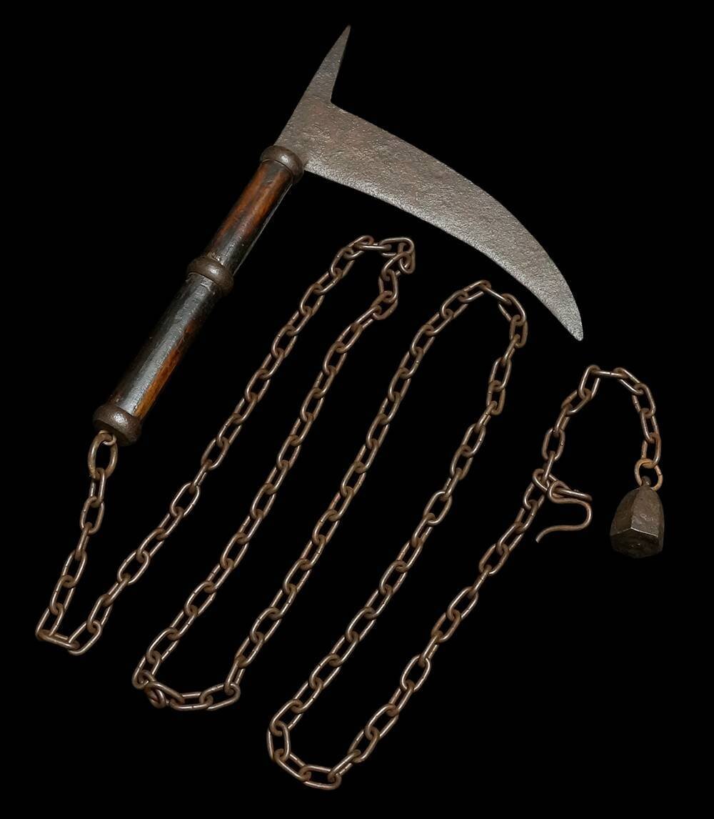 Дорогие читатели, пятая часть линейки необычных оружий уже перед вами, желаю вам приятного просмотра. Прошлые части: Кусаригама Кусаригама состоит из серпа, заточенного с одной стороны, рукояти и цепи, на конце которой был прикреплен грузик. Длина рукояти составляла примерно 60 см, длина серпа - 20 см, а цепь в свою очередь могла быть до 2.5 метров. Оружие могли метать в противника и возвращать с помощью цепи обратно, а так же имел место быть вариант того, что цепью удавалось замотать противника и добить серпом. Сань-цзе-гунь Сань-цзе-гунь представлял собой три соединенных между собой деревянных или же металлических палок, зачастую их соединяли веревкой или цепью. Интересная легенда: Во время битвы у Чжа́о Куанъи́нь сломался посох на три части, и тогда он соединил эти части друг с другом при помощи цепей. Крис Кинжал необычной формы, можно назвать его "младшим братом" фламберга, о котором я уже писал в прошлой своей статье посвященной необычному оружию. Благодаря необычному искривлению