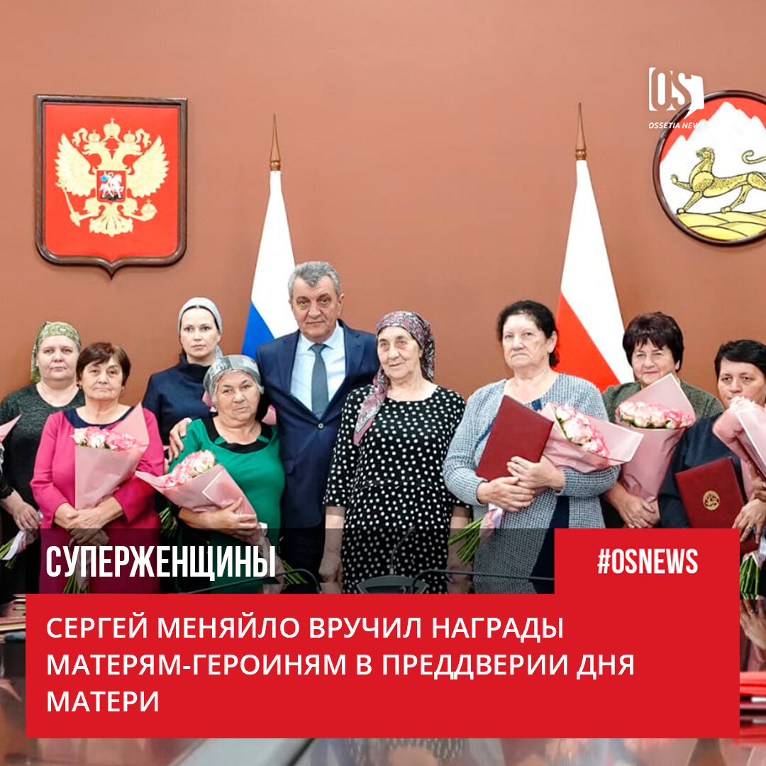 Женщинам, у которых 7 и более детей, присвоили звания «Мать-героиня Северной Осетии». Им вручили цветы и грамоты. Помимо звания каждой полагается выплата в размере 50 тысяч рублей. Награды вручил глава республики Сергей Меняйло. «Вы – женщины, которые воспитывают много детей и отдают им всю свою заботу и любовь. За это вам низкий поклон. Это тяжело: родить, воспитать, дать образование, направить на путь истинный. Поэтому вам огромное спасибо», – сказал глава. Государственные грамоты и почётное звание «Мать-героиня Северной Осетии» присвоили Таисии Алаговой, Ельвире Гамхеташвили, Елене Джигкаевой, Тамаре Есеновой, Наталье Лепехиной, Наталье Матиевой, Кларе Персаевой, Зое Танделовой, Валентине Тогоевой, Ирине Турунцевой, Любови Хидировой и Изольде Чельдиевой.