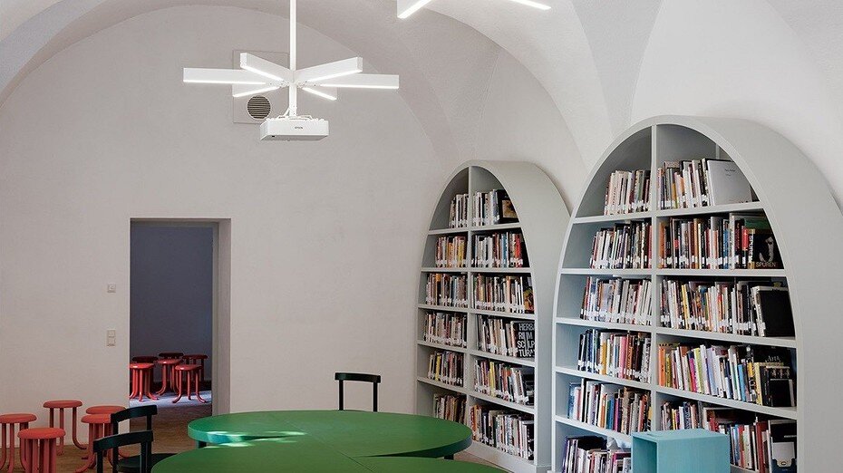 Для интерьера автор выбрал яркие и смелые цвета и с нуля создал мебель. А экстерьер памятника архитектуры сохранили в оригинальном виде. В Испании реконструировали старый средневековый замок и перепрофилировали его под библиотеку с читальным залом и арт-центром. Проект обновления памятника разработал дизайнер Мартин Фейерзингер, сообщает Designboom. Во время реконструкции было важно сохранить оригинальный фасад здания, заменив только детали в плохом состоянии. Новые элементы (как, например, оконные рамы и двери) встроили максимально незаметно. Они лишь ненавязчиво заманивают гостей зайти внутрь. Как рассказал автор источнику, во время реконструкции он обращался к книге «О божественной пропорции» Лука Пачоли с иллюстрациями Леонардо Да Винчи. Это произведение стало надежным подспорьем для создания гармоничных интерьера и мебели. Дизайнер изготовил массивные книжные шкафы в виде арок, которые часто встречаются в замке. Также установили круглые столы со стульями и оригинальные красные таб