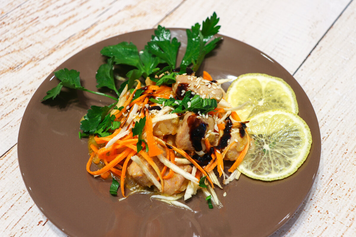 Тунец (филе) – 500 г Корень сельдерея – 1 шт. Лук репчатый – 1-2 шт. Морковь – 1 шт. Чеснок – 3-4 зубчика Свежая зелень (петрушка, сельдерей) – 20 г Смесь перцев молотая – по вкусу Корень имбиря тёртый – 1 ч. ложка Винный уксус – 1 ч. ложка Соевый соус – 1 ст. ложка Мёд – 1 ч. ложка Саке (водка) – 1 ч. ложка Кунжут Бальзамический соус – по желанию Масло растительное – для обжаривания Приготовление: 1. Лук нарезать полукольцами, морковь и корень сельдерея нашинковать соломкой, чеснок – кружочками, зелень порубить мелко. 2. Филе тунца нарезать средними кубиками. 3. В глубокой сковороде разогреть масло, слегка обжарить чеснок и специи. 4. Добавить кусочки тунца, обжарить на среднем огне до полуготовности. 5. Добавить лук, морковь, сельдерей и обжарить, помешивая 1-2 минуты. 6. Смешать соевый соус с уксусом, мёдом и водкой. Вылить смесь в жаркое, перемешать и тушить до готовности. 7. Перед подачей на стол посыпать жаркое кунжутом и свежей зеленью, полить бальзамическим соусом.