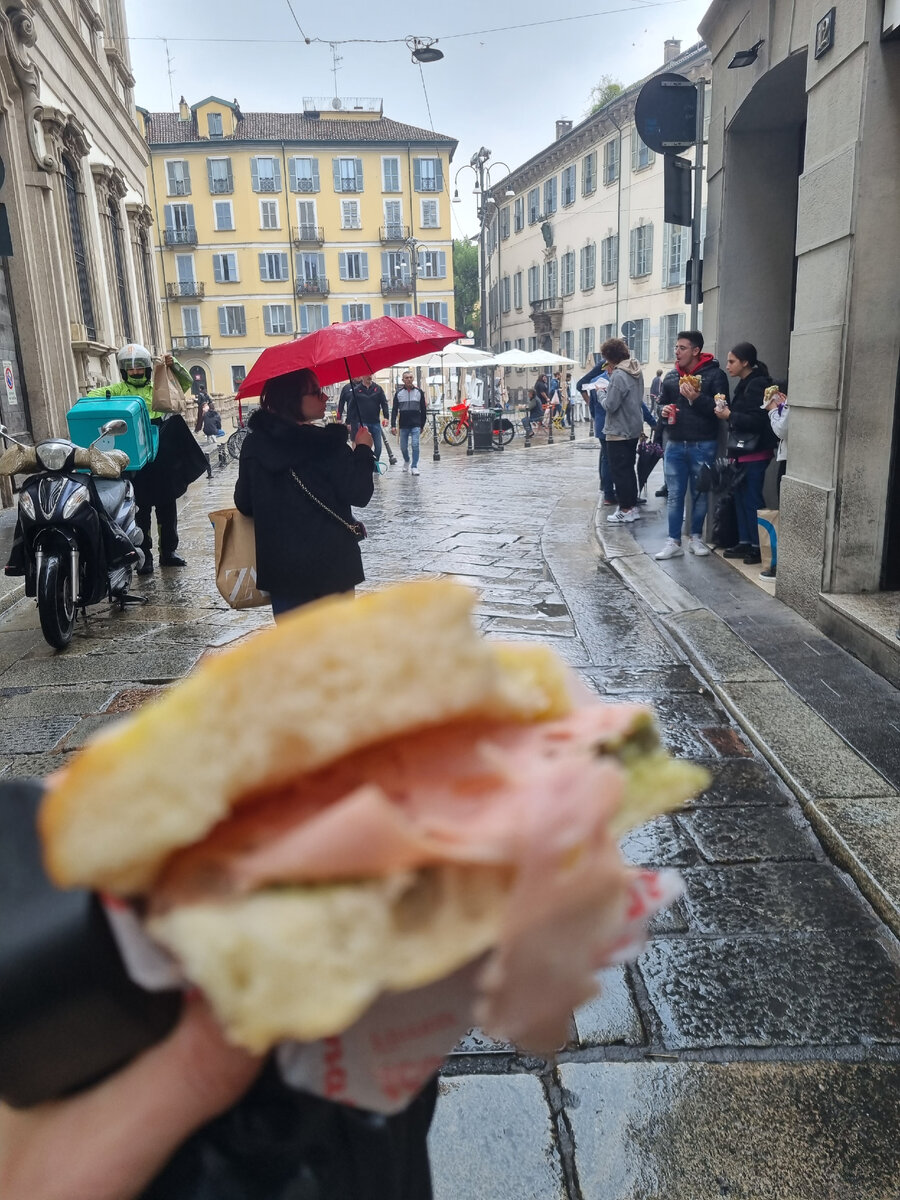 Начну с самого главного — с уличной еды. Это вкусно, это быстро, это или отвратительно или лучше не бывает. All’Antico Vinaio относится к "лучше не бывает". Еда там настолько восхитительна, что люди готовы стоять за ней час в очереди. И даже под дождем! А вы думали, что в Милане вечное солнце? Ничего подобного, это же осень. Еще вчера я в летнем платье и шляпе разгуливала, а сегодня искала выходца из Северной Африки, продающего зонтики у входа в метро. Нашла, теперь можно и за хлебушком. Господи, да как же у меня язык повернулся назвать это чудо с хрустящей корочкой хлебушком! Это — панини. Внутри — салями, мортаделла, карпаччо, порчетта , сыр, трюфели, орешки... В разных комбинациях, конечно.