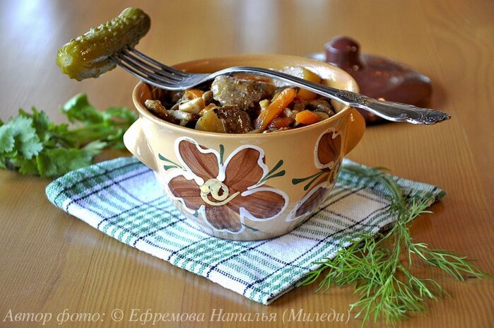 Этого рагу, никогда не бывает много. Очень вкусное исполнение. Не надо класть картофель или капусту. Потому что вкус блюда, будет иной. Здесь весь секрет заключается в исконно русском дуэте МЯСА и РЕПЫ. Все остальные ингредиенты, лишь дополняют эту основу. Ну а лесные грибы, придадут вашему рагу, ту самую осеннюю нотку. Ингредиенты, на 4 горшочка: Приготовление : Разрезать мясо на куски ( я отрезала мякоть от ноги), выложить в хорошо нагретую сковороду с небольшим количеством растительного масла и обжарить со всех сторон. К сожалению, не сфотографировала размер кусочков мяса. Они не были ни крупными, не мелкими. За 5-10 минуты до окончания жаренья высыпать к мясу нашинкованные овощи (БЕЗ ПОМИДОР и грибов). Пассеруем овощи с мясом минут 10. Именно в этот момент, мы солим и перчим, добавляем любимые приправы. Я не сильно усердствую, и использую лишь сухой чеснок либо рубленный свежий. Лавровый лист, по желанию. После этого сложить в керамические огнеупорные горшочки: На фотографии, зелен