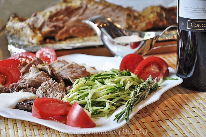 Запекаем баранину с розмарином и чесноком. Было бы корректнее называть это мясо ягнятиной (нога ягненка, окорок из ягнятины, мясо молодого барашка). Не с первого раза, я была довольна этим блюдом. Как говорится, Бог троицу любит. Лишь на третий раз, я нашла тот рецепт, что мне понравился на 100%. Начну с того, что мясо молодое. Во всех источниках пишут, срезайте всё сало. НЕ СОГЛАСНА!!! Я пробовала делать так, как советуют в Интернете и была разочарована. Не нужно ничего срезать. У молодого ягненка, ещё нет большого количества сала.А такое, лишь добавит блюду сочности. Не даст мясу пересохнуть, даже если вы немного провороните мясо в духовке. Ну и если совсем честно, то никакого запаха от баранины я не чувствую. Это наше любимое мясо. Поэтому когда пишут о каком-то запахе, я не совсем понимаю о чём речь. Может потому, что мы покупаем молодых барашков целиком (ярочек), у частника. Может магазинное имеет запах? Спорить не стану. Кстати, на фото кажется, что размер ноги, внушительный. Об