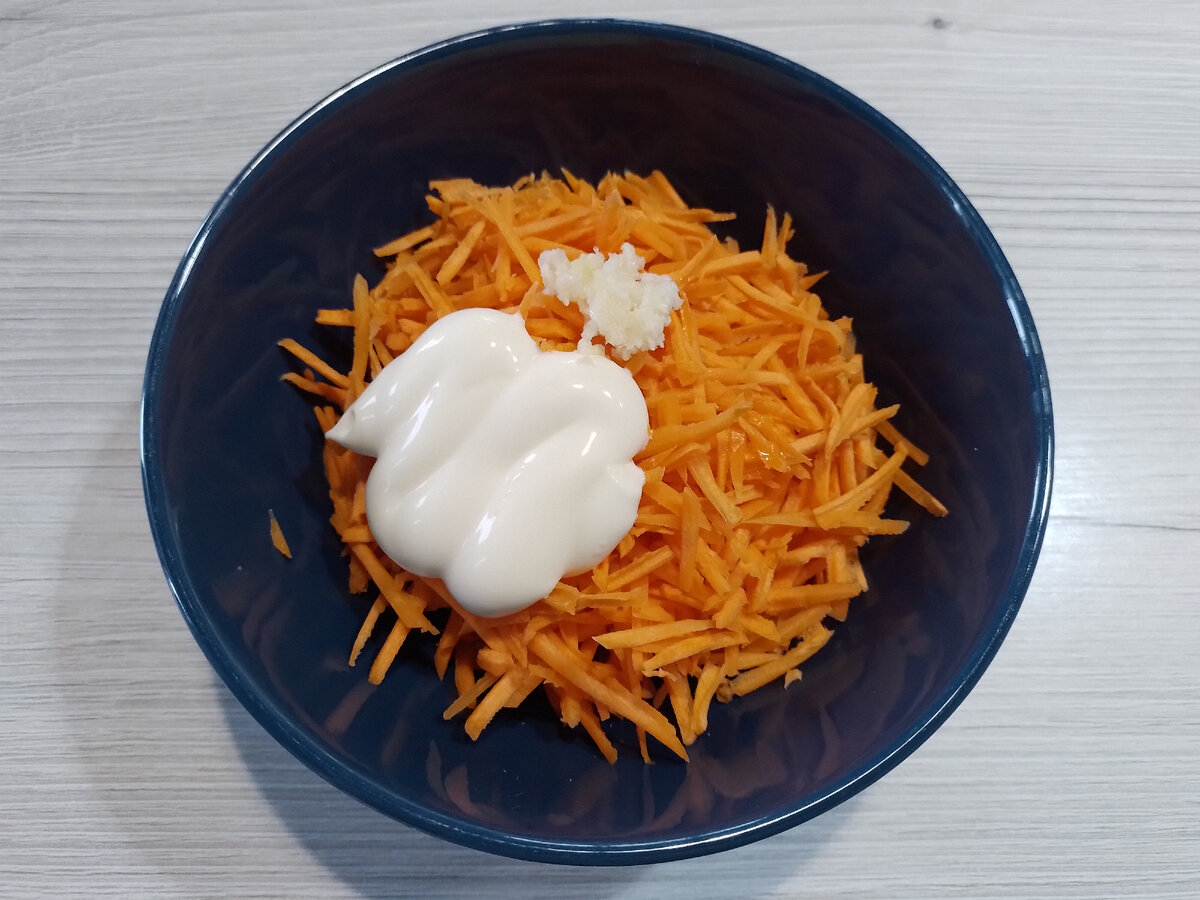 Кто любит слоеные майонезные салаты, Вы зашли, куда надо) Этот салат я попробовала приготовить впервые. Если честно, не ожидала, что так понравится. Хрустящие морковь, огурчики и лук придают салату оригинальный вкус. Это совсем не похоже на другие слоеные салаты, которые я пробовала раньше. Это не похоже на Оливье, не смотря на схожесть ингредиентов. Обязательно попробуйте приготовить. Мой муж и я в восторге) Для приготовления нам понадобится: 1. Первым делом натираем морковь, добавляем измельченный чеснок и 1 ст.л. майонеза. Перемешиваем. Оставляем в сторонке, чтобы морковь немного промариновалась. 2. Отвариваем картофель в мундире, яйца, куриное филе. Остужаем. 3. Картофель очищаем и натираем на крупной терке. Лучше всего этот салат делать с помощью формовочного кольца. Выкладываем в него слой картофеля и смазываем майонезом 4. Соленые или маринованные огурцы нарезаем мелким кубиком и выкладываем вторым слоем. Я использовала свои соленые. 5. Куриное филе нарезаем также мелким кубиком