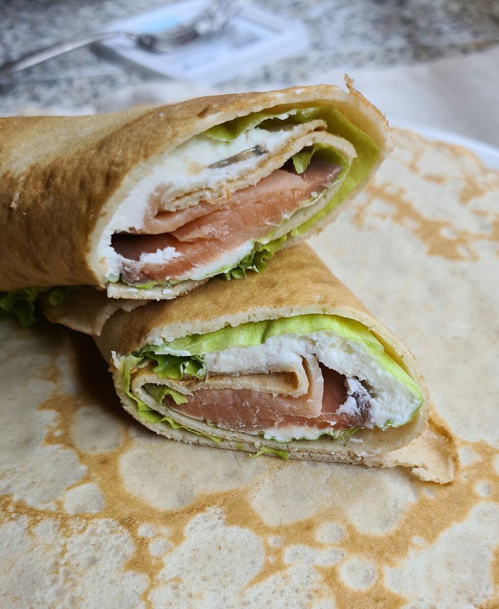Овсяные блинчики с творожным сыром и красной рыбкой
