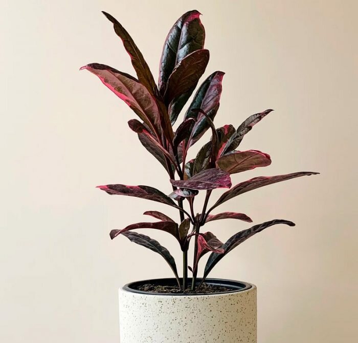 Такой кустарник украшен эффектными яйцевидными листовыми пластинами с заостренной верхушкой, которые окрашены в пурпурный или шоколадный оттенок. При этом изнаночная поверхность листьев окрашена в зеленоватый цвет. Такой вид в домашних условиях цветет очень-очень редко.