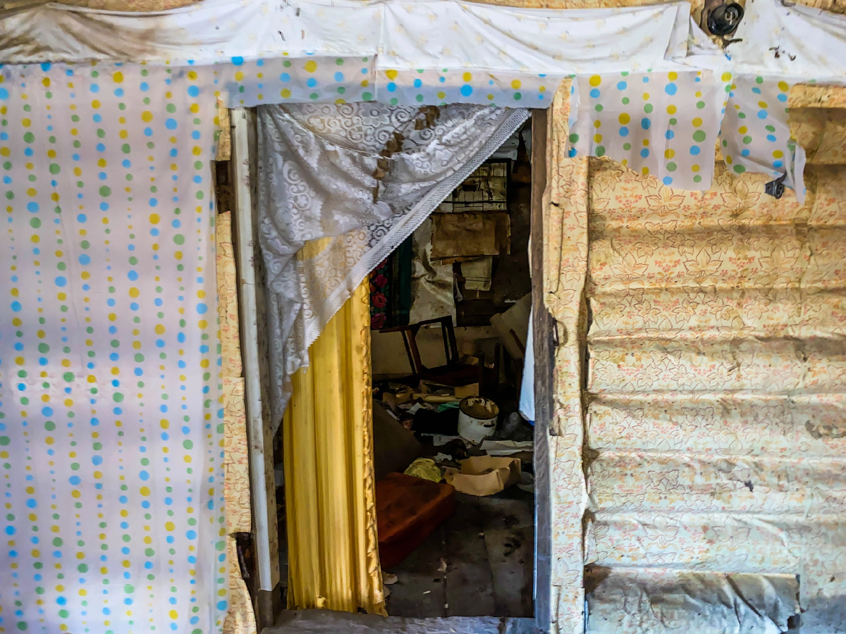 Всем привет! Продолжаем осматривать заброшенный дом, который мы нашли на пригорке на окраине одной глухой деревни. В прошлой публикации я показывал его веранду и сени. А сейчас мы зайдём в тёмный неотапливаемый чулан, посмотрим, что там осталось от прошлого. Чулан этот был достаточно захламлен. Там лежало много старых и теперь уже никому не нужных вещей. А на стене даже висел ковёр. На самом деле, это был даже и не ковёр, а просто ткань. Но смотрелась она стене даже очень неплохо. Стены чулана были обклеены обоями, которые даже не начали еще отслаиваться, как на потолке в сенях. А в углу этого чулана, на гвозде, висела старая куртка. Скорее всего, она принадлежала кому-то из жителей этого дома. На другой стене чулана висела еще одна ткань. Но она уже не так красиво выглядела, как та, что была похожа на ковер. Скорее всего, в этом небольшом помещении когда-то была летняя спальня. Зимой там спать, конечно, нельзя было, так как помещение не отапливалось, но летом использовать этот чул