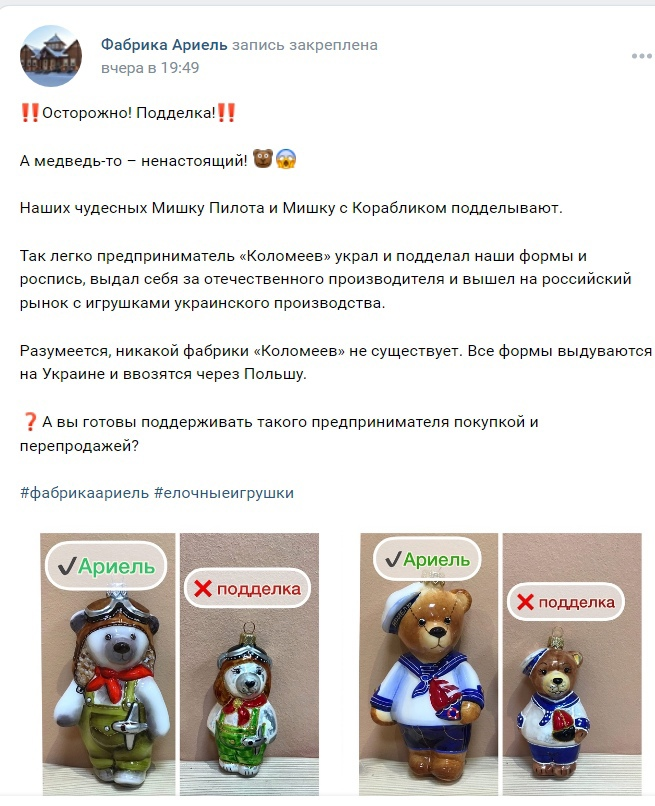 Пока побывала в трёх гипермаркетах, но то, что там увидела, навевает тоску. И попалась мне в интернете информация о наших производителях игрушек, которая меня отправила в нокаут. Всегда отличный выбор игрушек был в гипермаркете "Твой дом". Там не были представлены российские фабрики, но украинские, польские и немецкие игрушки всегда можно было выбрать. Но не сейчас. Похоже, новых поставок не было, продают прошлогодние остатки. Все магазины завалены продукцией "Коломеев". Несколько дней назад я рассуждала о происхождении игрушек. Умом я понимала, что заявленные 2 миллиона в год фабрика, о которой никто не слышал и которую никто не видел, произвести не может. Смущали ещё и копии игрушек известных брендов - Лисичанской фабрики, "Ёлочки" и "Ариель". И вот как раз на фоне моих раздумий в ВК в группе "Ариель" появился вот такой пост И всё сразу встало на свои места. Но в комментариях к этому посту было много возмущений. Люди упрекали нижегородскую фабрику, что игрушек нет в наличии, да и