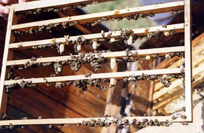 Перебирая и просматривая журналы прошлых лет, я натолкнулся на статью «Вывод маток на малой пасеке по методу Цебро» (ж-л «Пчеловодство» № 2-3, 1998 г.). В двух журналах на шести страницах В.М. Ланговой описывает как выводить маток с огромным числом лишних операций: поставить, переставить, поднять, опустить, передвинуть и т.д. А ведь достаточно всего нескольких простейших приемов. В самой хорошей семье я отбираю матку. Через 2-3 ч беру из нее светлый сот с яйцами, в теплом ящике заношу в комнату и вырезаю из него полоску ячеек с засевом шириной 20-25 мм. С одной стороны горячим ножом, нагретым в воде, срезаю ячейки до донышка. С другой стороны высоту ячеек уменьшаю наполовину, а яйца выбираю из двух соседних, оставляя в третьей яйцо (если маток нужно немного, то оставляю не более шести). Затем полоску разрезаю на отдельные квадратики с ячейкой с яйцом посередине и приклеиваю их теплым воском к деревянным пластиночкам-клинышкам. Далее приклеиваю тем же теплым воском клинышки к прививочн