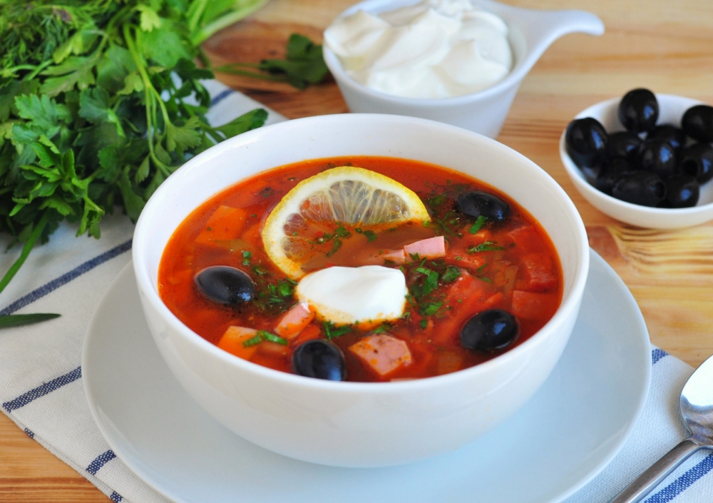 Найти способов, как приготовить солянку, можно большое количество. Это блюдо очень популярно и у каждой хозяйки есть свои маленькие секреты приготовления. Обязательные же составляющие классической солянки - это наваристый бульон, несколько видов мясных продуктов, овощи и красивая подача с лимоном и маслинами. Солянка классическая имеет насыщенный мясной вкус с небольшой кислинкой.