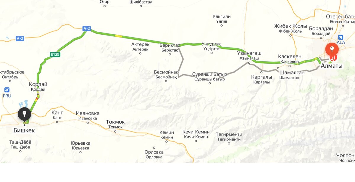 Россияне могут находиться в Казахстане 90 дней. Если выехать и вернуться обратно, можно остаться ещё на 90. Это не общее правило, скорее, несостыковка в законодательстве. Сейчас на рассмотрение внесены поправки, которые могут ликвидировать эту лазейку. Вот мы и решили скататься в Бишкек, пока не поздно. Из Алматы ехать не так далеко, 260 километров. У нас, правда, получилось 400. Трасса в принципе хорошая, но есть объезды по разбитой грунтовке из-за дорожных работ. Мы немного переживали из-за погоды и возможного гололёда на перевале. Но гололёда не было, был только туман, а перевала мы, в общем-то, и не заметили. Дорога идёт по степи вдоль высоких гор, а потом, где они становятся пониже, сворачивает на Бишкек. На границе близ города Кордай неприятный сюрприз. Длинная очередь и перспектива простоять, по словам местных, часов 6. Принимаем решение ехать на соседний КПП, он недалеко, называется "Карасу". Там, оказывается, пропускают только грузовой транспорт. Пограничники советуют ехать