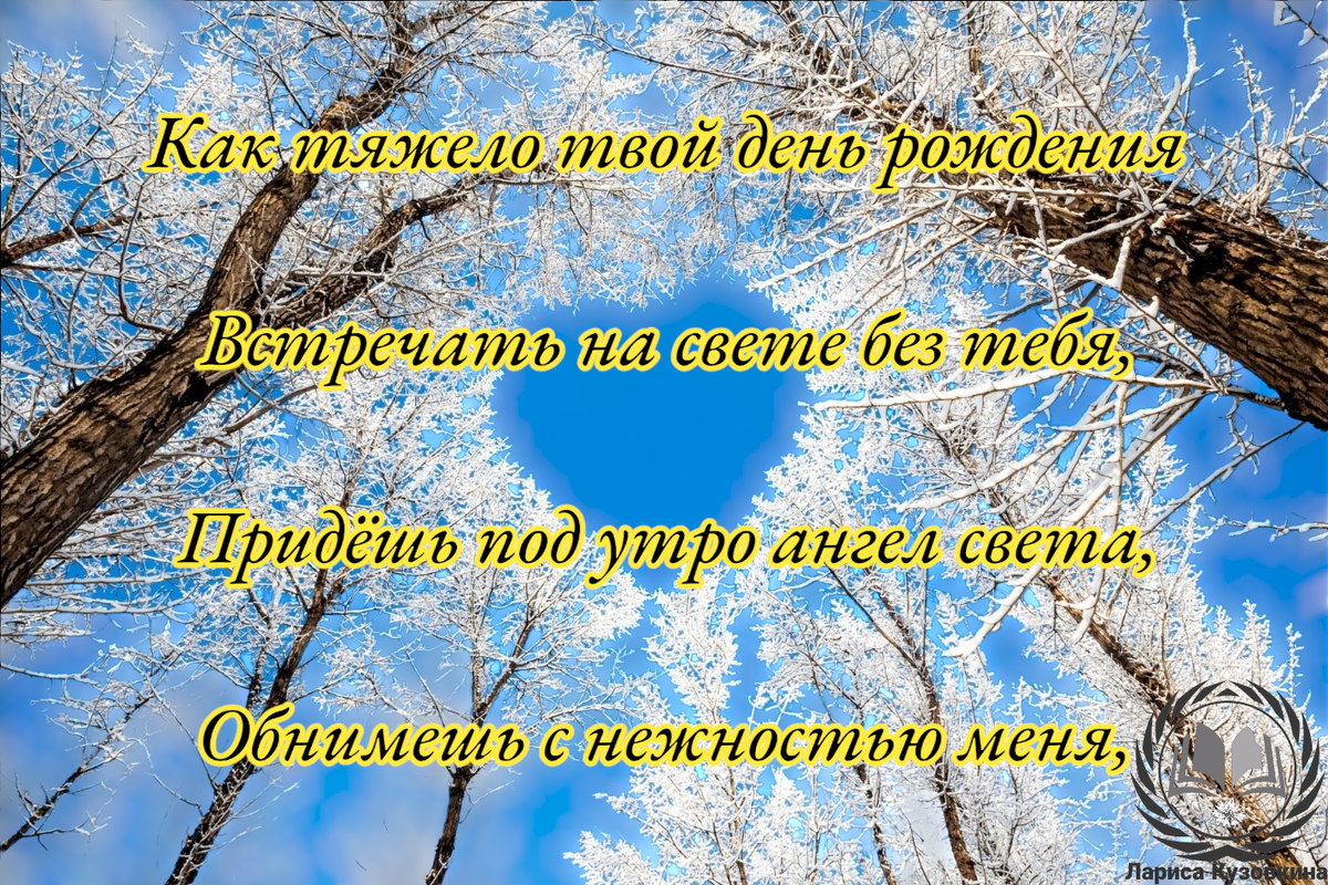 Как тяжело твой день рождения Встречать на свете без тебя, Придёшь под утро ангел света, Обнимешь с нежностью меня, Шепнешь тихонько:" я с тобою, Не плач, родимая, прошу... Я в небе яркою звездою Твой путь тернистый отыщу, Я рядом, пусть меня не видно, Но посмотри, я знак прислал, Да, знаю больно и обидно, Что я с собой тебя не взял. Но ты должна нести свой крест, Молиться за меня, родная... Ты просто знай, что я воскрес, Давно уже во Царстве Рая. Ты знай, что я всегда с тобой, Снижинкой упаду на плечи, Поверь мне, мама, я живой, И наша состоится встреча..." Я слышу голос твой сынок, И в сердце теплится надежда, Что смилуется мудрый Бог, И будем рядом мы как прежде. 12.02.22 Лариса Кузовкина