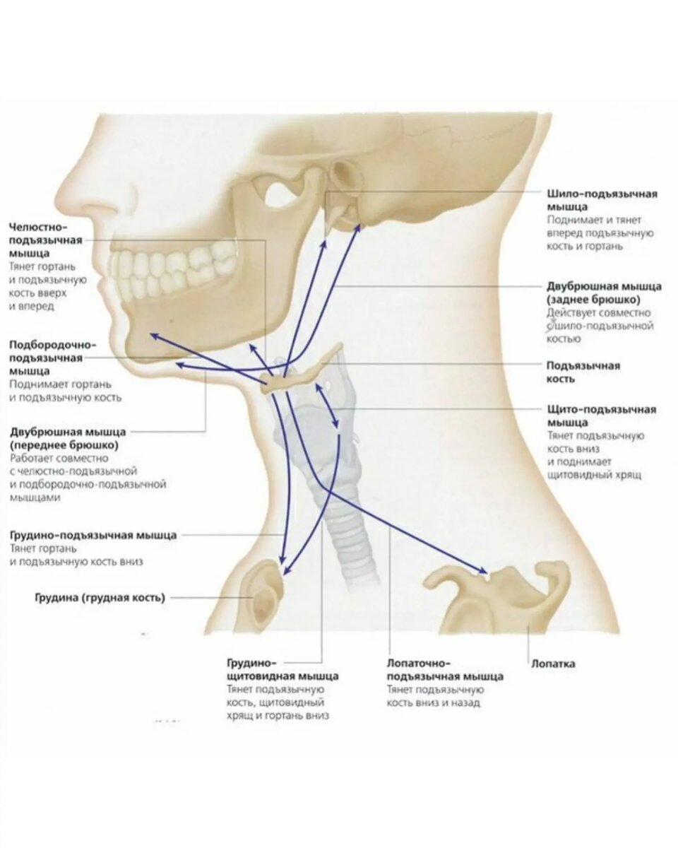 Плюс есть такая мышцы, лопаточно-подъязычная, прямо рядом с щитовидным хрящём проходит, её напряжение ограничит свободу наклона щх.