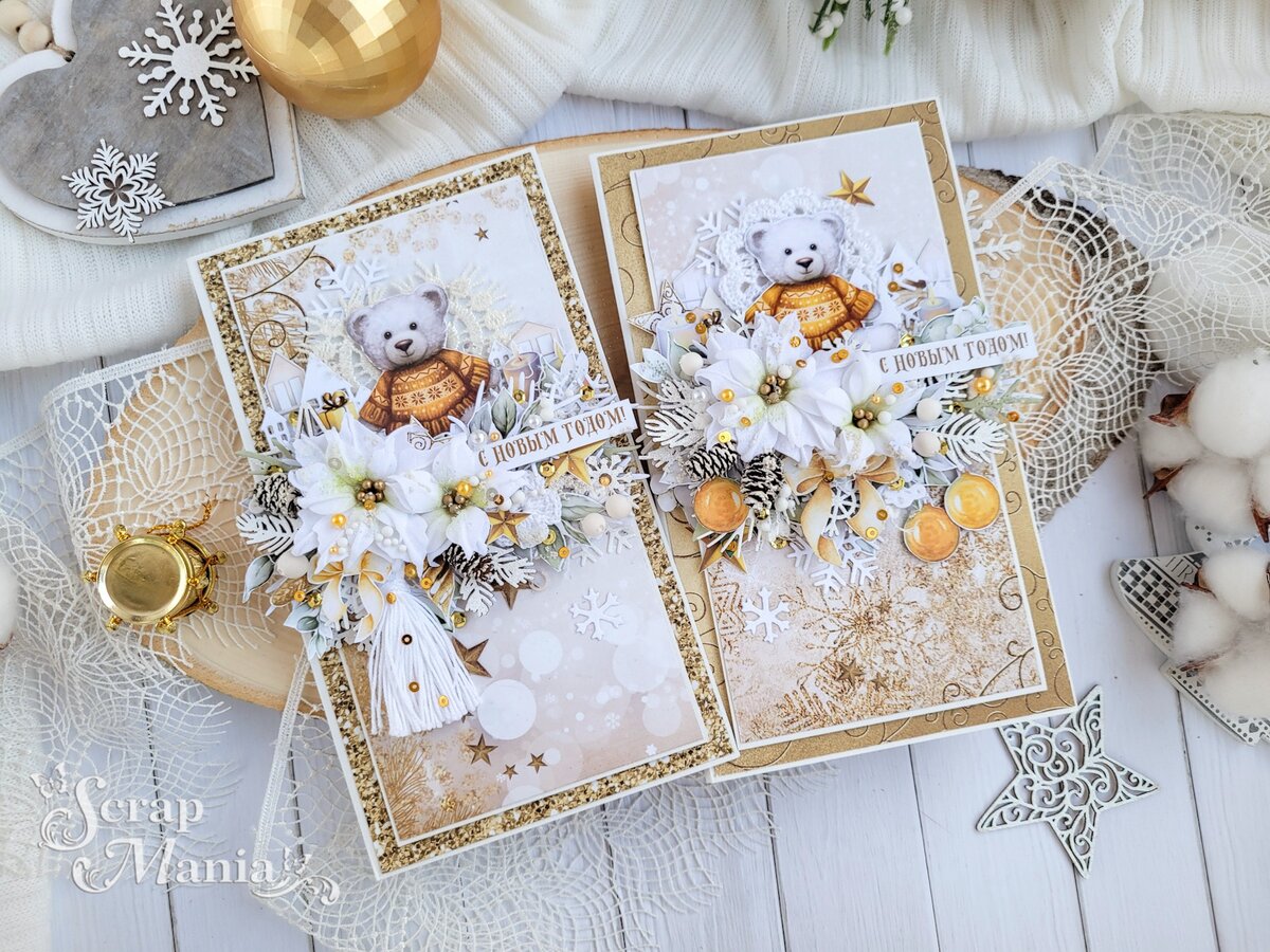 Вся информация по проекту находится в теме в группе вКонтакте, там же можете задавать интересующие вас вопросы Дорогие любители теплых открыток, мы рады объявить о начале третьего этапа! И вдохновлять вас сегодня буду я, Elena Veres. Третий этап называется "Зимний уют" с обязательными вязаным элементом и чипбордом. Представляю вам пару открыток из не теряющей своей новогодней актуальности коллекции "Сканди Новый год". Мои открытки украшают разные вязаные элементы: белоснежная салфетка, небольшой белый цветок и кисточка. А главными персонажами выступают плюшевые медвежата в теплых вязаных свитерах, это вырезанные элементы из скрап-карты "Сканди Новый год. Картинки и теги". Второй обязательный элемент - чипборд из набора "Волшебный снегопад. Праздничный декор" - я покрыла белой сверкающей пудрой для эмбосинга. Открытки получились зимними и белоснежными, но с теплыми и уютными бежевыми, желтыми и золотистыми акцентами. Предлагаю вам вместе со мной сделать одну из представленных новогодни
