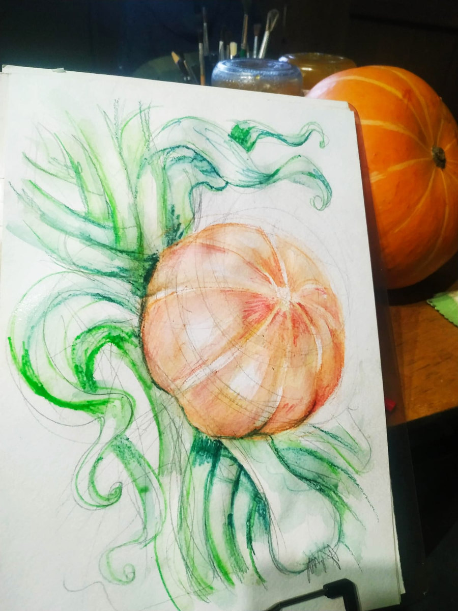 Еще одна тыква, запечатленная живьем, порей ей в помощь. Простой карандашный набросок+акварельные карандаши Когда "мокрая работа" завершена, а акварельные карандаши имеют свойство именно после встречи с водой давать размытый эффект живой краски, можно стереть все лишнее. В свойственной мне манере прорабатываю детали черным линнером и чуть-чуть размываю местами. Как рождается композиция и почему у меня все именно так, а не иначе выходит из под руки, объяснить не смогу. Оно как бы и само рисуется. Итак, последний штрих и... выдох. Остается показать рисунок инспектору Якову Бумбулешти. Он, хоть и не искусствовед, но глаз у него наметан на все, что подозрительно и не в порядке. Изучал довольно долго. Правду-матку рубил с плеча... В выражениях не стеснялся... И в конце концов вынес вердикт: рисунок надо повернуть! Иначе тыква свалится с листа, отбив Коте Бабину лапки... и никакой порей ее не удержит! Вот так! Ну, надо, так надо? Мне ли спорить с инспектором...)