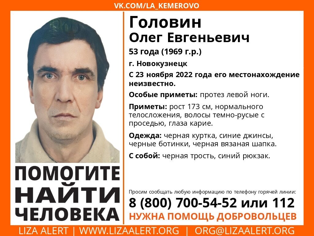 В Новокузнецке разыскивают пропавшего без вести 53-летнего Олега Евгеньевича Головина. Сообщение об этом появилось в группе «Лиза Алерт» Кузбасс во ВКонтакте. Местонахождение мужчины неизвестно с 23 ноября. Волонтёры уточнили, что мужчина был одет чёрную куртку и ботинки, синие джинсы и чёрную вязаную шапку. Рост кузбассовца 173 сантиметра, нормальное телосложение, тёмно-русые волосы с проседью, карие глаза. Из особых примет у мужчины протез левой ноги. Всех, кому что-либо известно о местонахождении Олега Головина, просьба сообщать по телефонам: 8-800-700-54-52 или 112. Фото: ПСО «Лиза Алерт» Кузбасс