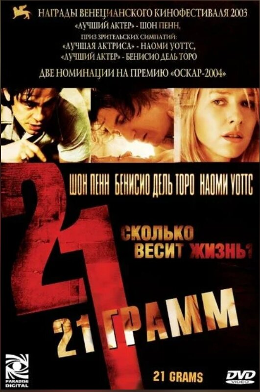 Говорят, что каждый человек в момент смерти теряет 21 грамм. Столько весит горстка монет в пять центов, плитка шоколада, птица колибри... «21 грамм» - это история о надежде и человечности, жизнелюбии и выживании. Независимо от того, боитесь вы смерти или нет, она приходит, и в этот момент ваше тело становится на 21 грамм легче. Быть может, это вес человеческой души?