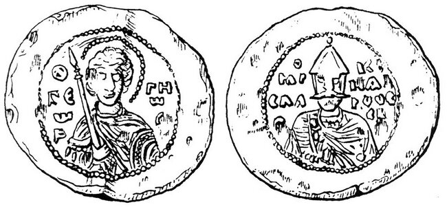 Ну, во-первых, на аверсе (лицевой стороне) в те времена помещали изображение святого Георгия (небесного покровителя Ярослава Мудрого). Во-вторых, на реверсе не фигура князя Ярослава, а его погрудное изображение в застёгнутой фибулой одежде, в высоком шлеме, с торчащими усами и бородой. Но Андрей Сергеевич бороду у князя не разглядел: «лицо князя украшают только усы, как на других дошедших до нас изображениях типичных славянских воинов раннехристианской эпохи. Византийская традиция ношения бород «войдёт в моду» позднее, да и то поначалу у духовенства».