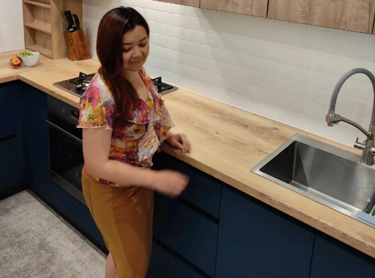 С Петром мы сотрудничаем много лет по поставке светодиодной продукции. Было приятно, когда он обратился к нам с запросом изготовления кухни. Попросил сделать продуманно, стильно и экономично. Естественно, я сразу стала выяснять планируемые сроки эксплуатации. Выяснилось, что заказчики мечтают переехать однажды из Перми. Возможно, в ближайшие 5 лет. Поэтому фурнитуру я предложила поставить китайскую, ресурса которой хватит на указанный срок. Ввиду того, что нагрузка на верхние фасады значительно меньше, чем на нижние, предложила сделать их из ЛДСП, как корпус, максимально близко к цвету столешницы, чтобы смотрелось единым ансамблем. Естественно, я объяснила, что ЛДСП - продукт не влагостойкий, и есть определенные риски. Заказчики согласились. Также сэкономили, состыковав столешницы по глубине (зона окна), так как глубокий вариант - это долго и дорого. Фартук укладывали после кухни, чтобы исключить использование плинтуса. Затирку сделали в цвет плитки, оно теперь не отвлекает внимание