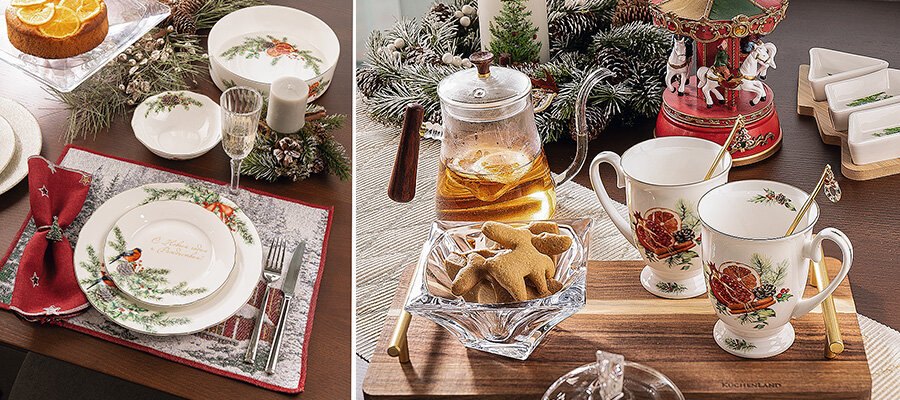 В ней снежно-белая посуда украшена традиционными принтами: часы, еловые венки и нарядные елочки. Создайте с ней домашнюю семейную сервировку. Чтобы подчеркнуть атмосферу уютного праздника, откажитесь от скатерти. Центральную часть сервировки соберет дорожка, а остальное пространство останется свободным. Этот прием хорошо работает с деревянными столешницами.