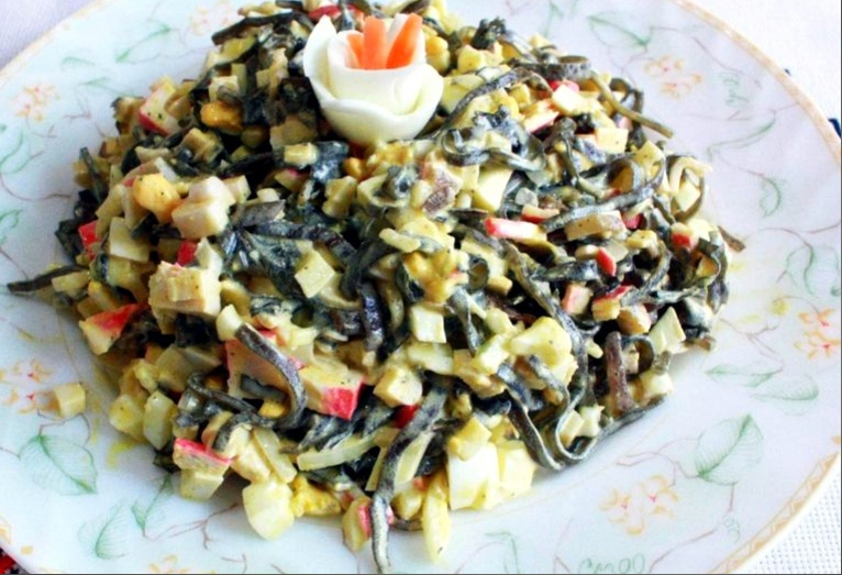 Морская капуста - продукт на любителя, но в пользе ее никто не сомневается. Попробуйте, может быть в сочетании с другими составляющими, вы посмотрите на морскую капусту другими глазами. Эти полезные, легкие и оригинальные салаты украсят любой праздничный стол. С крабовыми палочками Отварите яйца и картофель (по желанию можно добавить морковь), охладите. Яйца, картофель, соленые огурцы и крабовые палочки нарежьте кубиками. Из морской капусты и горошка слейте жидкость. Выложите в салатник все ингредиенты и заправьте майонезом. Можно салат выложить слоями и подать в широких стаканах: картофель, огурцы, яйца, морская капуста, крабовые палочки, горошек. Каждый слой слегка промазывайте майонезом. С морским коктейлем Отварите морской коктейль в подсоленной воде 15 минут, а затем охладите и нарежьте небольшими кусочками или соломкой. Лук нарежьте тонкими полукольцами, если будете добавлять морковь, то натрите на корейской терке или нарежьте очень тонкой соломкой. Соедините овощи с морской ка