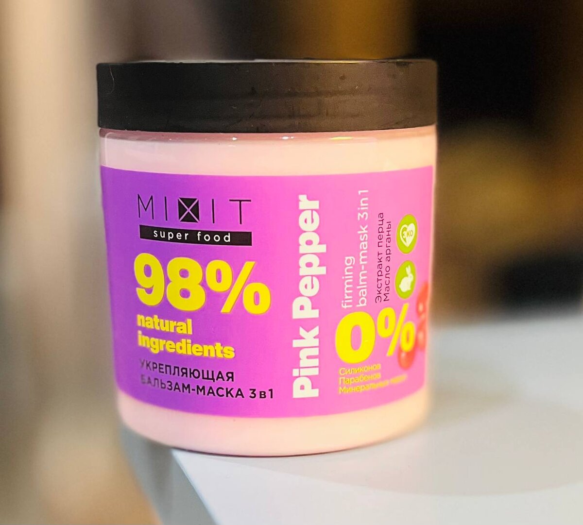 Недавно я рассказывала вам о том, что приобрела для себя серию от Миксит Super Food с 98% натуральных ингредиентов. Подробнее вот тут: Вместе с шампунями и гелями для душа, я купила и маску для укрепления волос. Она тоже не содержит минеральных масел, силиконов и парабенов. Шикарный по аромату и действию продукт. Сперва я использовала её как маску и мне очень нравилось увлажнение, как волосы выглядят после её применения. Но потом прочитала, да я не всегда полностью читаю упаковки, что её можно использовать как бальзам и как несмываемое средство. Очень удивилась, ведь она такая плотная и думала, что волосы будут жирненькими, но нет. Попробовала нанести на влажные, подсушенные волосы немного состава и просто обомлела когда высушила. Они стали такие послушные, гладкие и блестящие, что просто WOW — настоящие волосы мечты. Очень красиво блестят, выглядят живыми, хотя я их только и делаю, что осветляю. А они прямо так хорошо стали выглядеть. Ну и плюс какая экономия. Сама маска стоит недор
