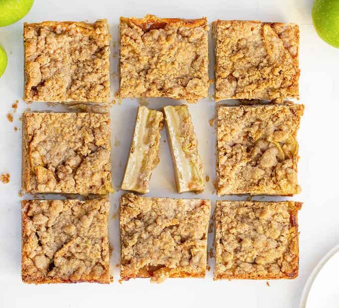 Песочные пирожные с яблоками — это многослойный десерт. На тонком корже из песочного теста лежит сочный слой пряных яблок, покрытых хрустящим запеченным штрезелем.