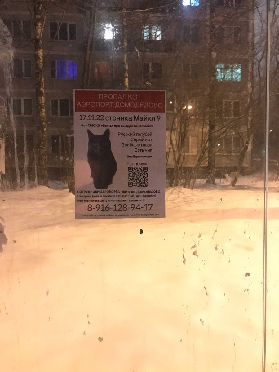 Напомню, что 17 ноября при выходе из самолета компании S7 в 20:53, рейс 1056, на стоянке Майкл 9, раскрылась переноска и кот СМОКИ сбежал в поле аэропорта. БЕЖАТЬ ЗА КОТОМ И ИСКАТЬ НЕ РАЗРЕШИЛИ! Уже 10 дней аэропорт Домодедово не организует самостоятельные поиски и не даёт разрешение на поиск кота хозяйке и родственникам. Собран чат из более 300 человек для помощи в поисках. Москва 24 и Виделивидео поддержали поиски информационно. Несколько человек выходят клеить и раздавать объявления. Вчера ,на территории аэропорта, сотрудники нашли кошку, очень похожую на Смоки. В ближайшее время надо найти ей дом или куратора. По ней звоните мне 8926555846пять Уважаемые сотрудники аэропорта и жители ближайших населенных пунктов- вступайте в чат поиска🙏 СМОКИ МОЖЕТ ПОГИБНУТЬ ОТ МОРОЗА И ГОЛОДА! Он же не виноват. #найдитесмоки Анастасия +7 (916) 128-94-17 #аэропорт #домодедово #потеряшка #кошки #кот #найдитесмоки