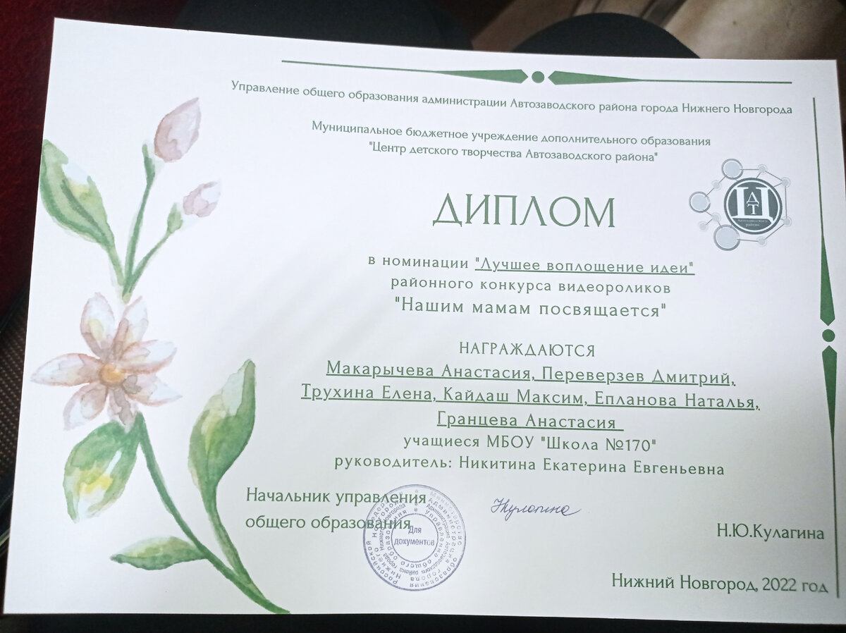 Наше видео поздравление отозвалось во многих сердцах . И мы стали призерами в номинации "Лучшее воплощение идеи", были приглашены на праздничный концерт ко дню Матери в ЦДТ Автозаводского района и награждены грамотой. Награду получили не только дети, но и лучшая мама школы №170 - Трухина Наталья.