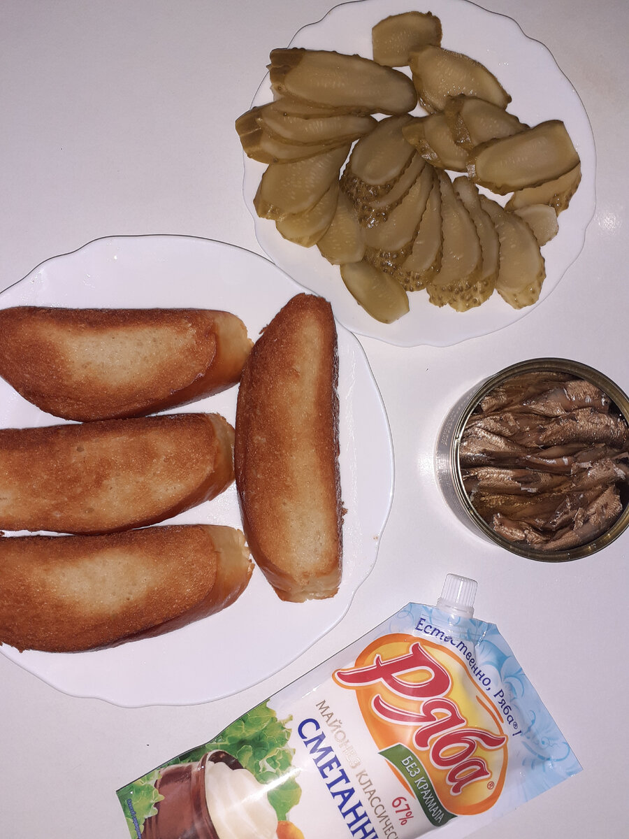 усмотрение (я обычно использую шпроты из салаки, так как они по размеру чуть больше шпрот из кильки - но этот факт никак на вкус бутерброда не влияет - просто ваше предпочтение и ничего более того); 3. так же нам понадобятся маринованные (соленые) или свежие огурцы (берете то, что больше всего вам предпочтительно - так и этак будет очень вкусно); 4. май