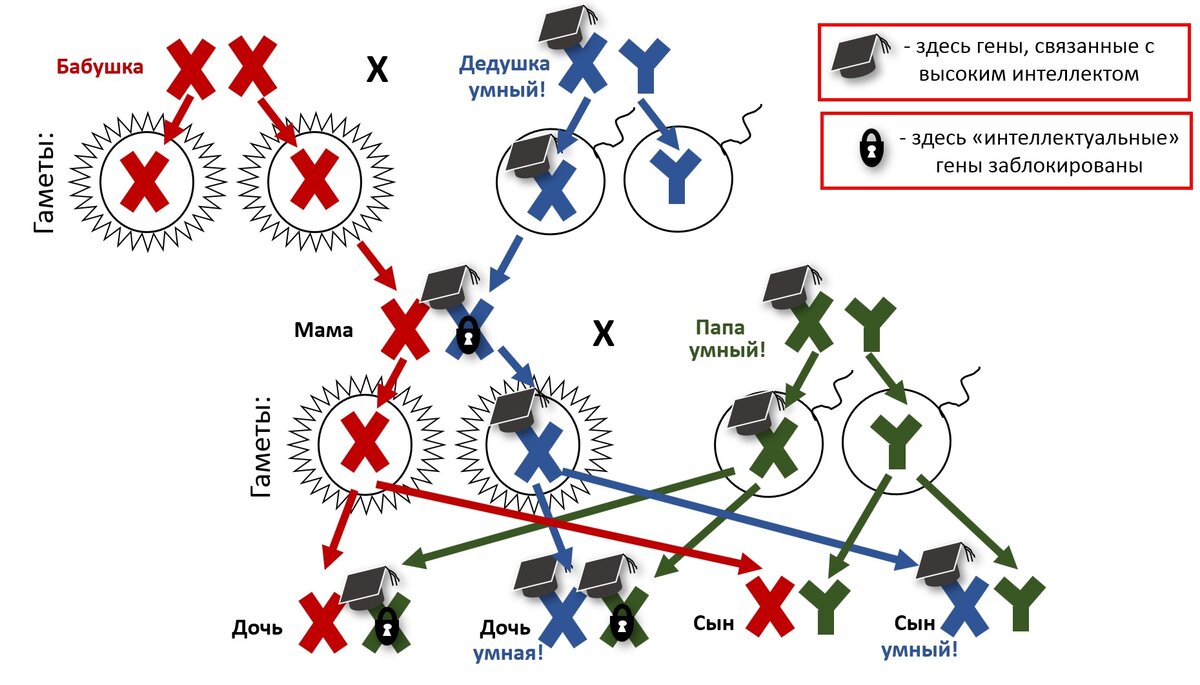 Видите, от бабушки мама получила не особо "интеллектуальную" Х-хромосому, а от дедушки -очень даже "умную". Но дедушкины "умные" гены ей не помогли, потому что гены, отвечающие за интеллект, приходящие в женский генотип от отца, блокируются.