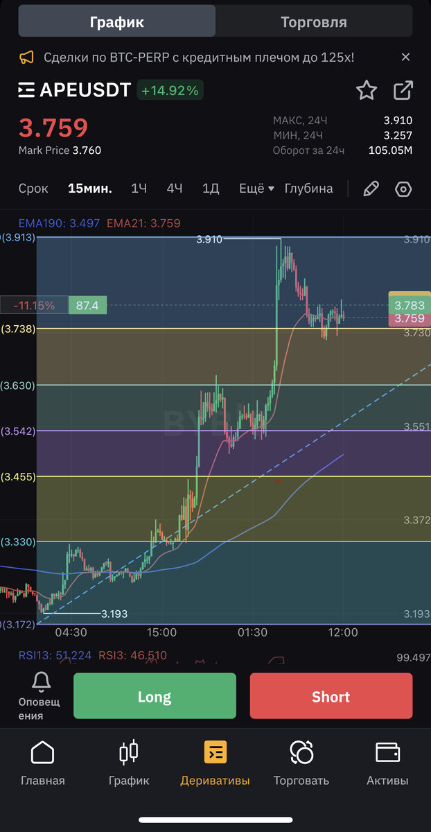 купил монету APEUSDT в продолжение бычьего тренда после небольшого накопления на таймфрейме 15мин