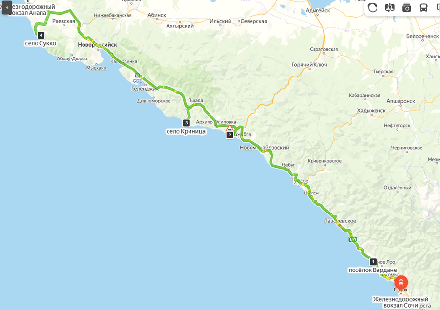 - п. Сукко – 5 дней. Конечно, на данном отрезке можно выделить множество других интересных мест для остановки, но мы постарались в этом путешествии познакомиться со всем многообразием предгорий Кавказа. Передвижение осуществлялось на общественном транспорте. Протяженность маршрута сост